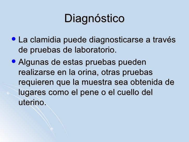 - La clamidia puede diagnosticarse a través de pruebas de laboratorio. Algunas de estas pruebas pueden realizarse en la orina, otras pruebas requieren que la muestra sea obtenida de lugares como el pene o el cuello del uterino.