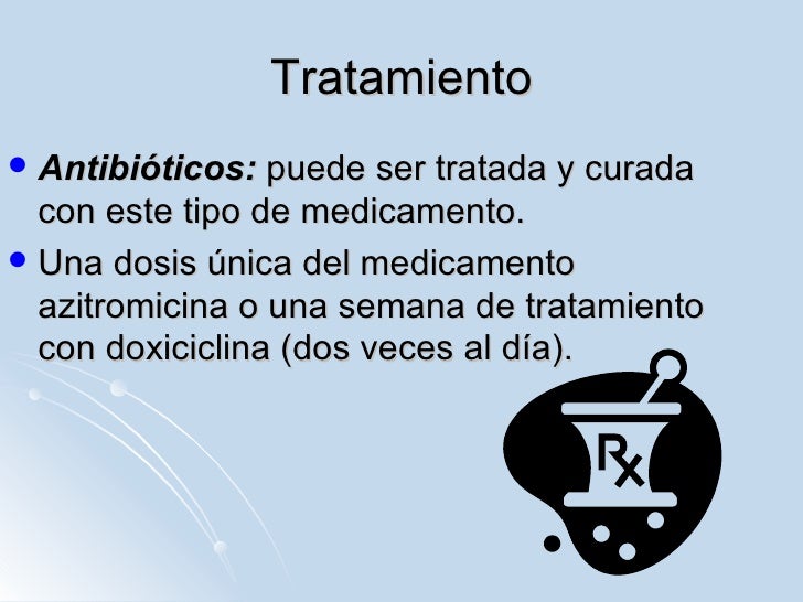 - Antibióticos: puede ser tratada y curada con este tipo de medicamento. Una dosis única del medicamento azitromicina o una semana de tratamiento con doxiciclina (dos veces al día).